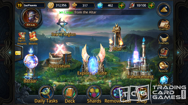 Evet, oyunu açar açmaz karşımıza bir “neler var?” ekranı geliyor. Hearthstone gibi Heroes’a benzediğini de söylemiştim. Bu benzeşme özellikle ana ekranda karşımıza çıkıyor. Heroes oynayanlar bilirler (Oynamayan yok değil mi?), kendi şehrimize tıkladığımızda, nezih bir düzlük bulur, bu düzlüğe seviye seviye binalar eklerdik. Burada oyun, bu ek bölümleri siz seviye atladıkça kendisi ekliyor.