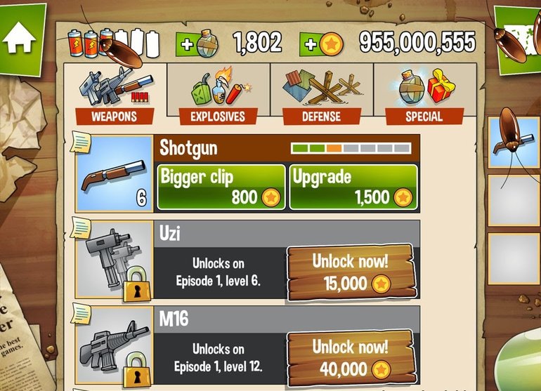 Düşmanları öldürmek için, ilk başta elimizde baba yadigarı pompalı tüfeğimiz var. Her bölümün sonunda ne kadar başarılı olduğumuza bağlı olarak bir miktar altın kazanıyoruz. Kazandığımız altınlarla elimizdeki silahımızı ya da mevcut bombalarımız geliştirebilir, evimize savunma ekleyebilir yeterli miktara ulaşınca da yeni silahlar alabiliriz. İşin geliştirme kısmında sorun yok. Ufak miktarlarla işe yarar şeyler yapılabiliyor. Ama yeni silah almak biraz zor gibi geldi bana (gerçek parayla alınabiliyor elbette). Yeni silahlar pahalı ve hal böyle olunca pompalı tüfeğimiz uzunca bir süre ellerimizde kalıyor.