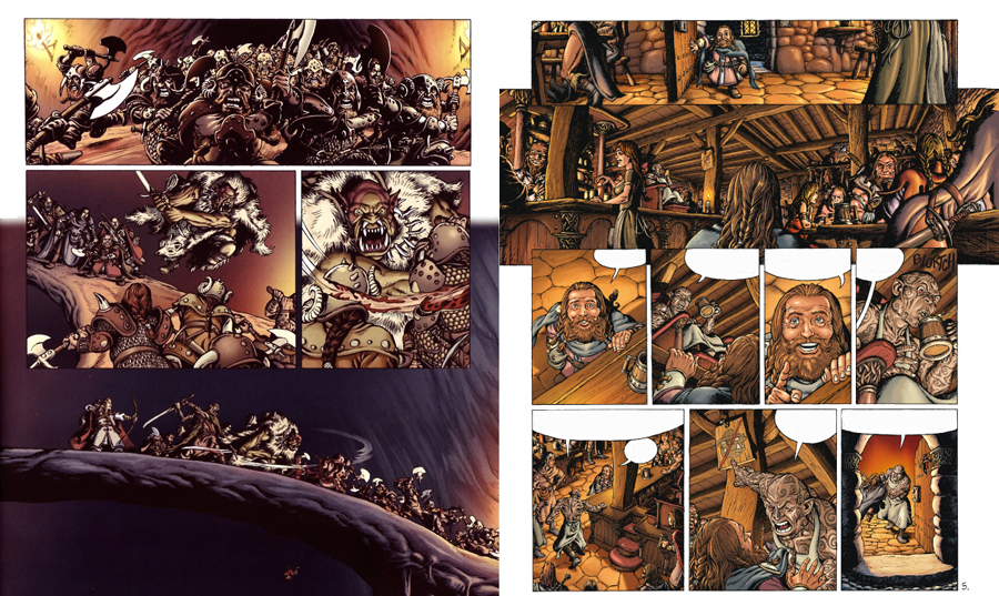 Hikayenin senaryosunu David Chauvel yazmış, çizimini ise Jérome Lereculey üstlenmiş. Ben kendi adıma çizimleri oldukça güzel buldum. Bütün kareler ziyadesiyle dolgun, ayrıntısı bol ve uzun uzadıya baktıkça göze hitap edecek düzeyde. Yalnız söz konusu “cüceler” ve “fantastik diyarlar” olunca, farkına vardığım şey “Tolkien”in cüce şehri tasvirinden öteye arpa boyu bir ilerleme yok. Bazı karelere baktığımda, Lotr filminde yüzük kardeşliğinin ilerlediği sahneler canlandı gözümde. Tolkien’in cüce şehri tasvirleri demiştim ya, Khazad-dum köprüsünün birebir aynısını buradaki cüce şehrinde de görüyoruz. Eh artık bu hayal gücü noksanlığı mı? Yoksa büyük ustaya bir saygı duruşu mu, tam kestiremedim. Hikaye ile ilgili kısımlara en sonda değineceğim.