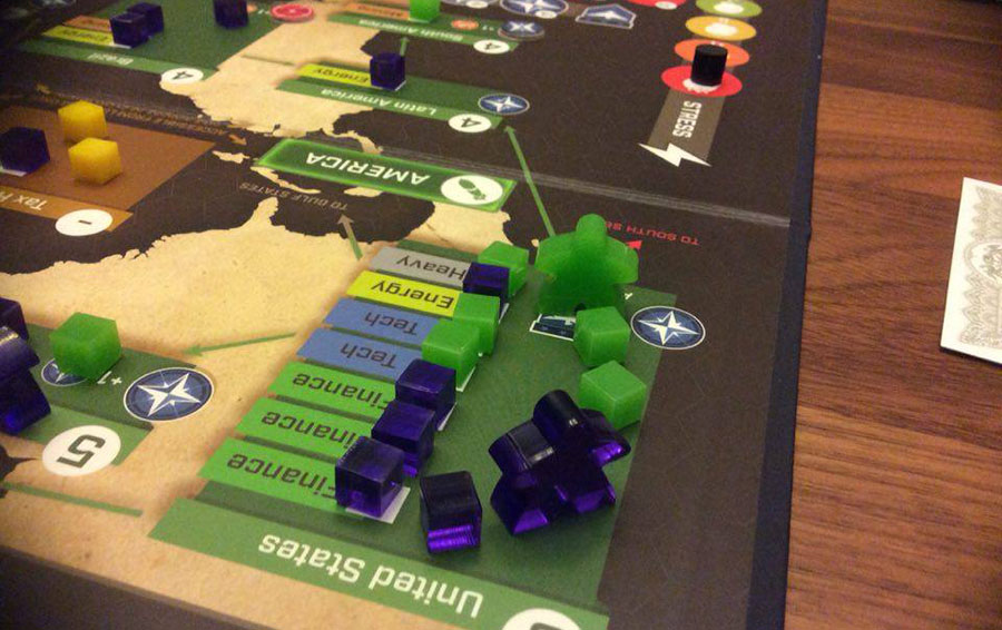 İkinci faz ise oyuncuların borsası olan ana ülkelere yatırım yapma fazı. Oyuna hiç bir özel gücü olmayan oyuncu “fortress derivatives” başlıyor. Bu fazda işçilerinizden birini göndererek bir hisse, artı aynı bölgede bir yatırım için açık artırma başlatıyorsunuz. İşçi demişken, her oyuncunun iki, dördüncü oyuncu “old money”nin ise üç işçisi var. Bu açık artırmayı başlatan kişinin tek avantajı ilk bidi yapmak. Bu noktada açılmış olan yatırım kartları hisse değerlerini artırıyor diyebilirim. Bu açık artırmalardan birini kazanan oyuncu, örneğin artırma ABD’de ise bir ABD hissesi ve ABD’de boş yatırımlardan birine girme hakkı kazanıyor. Eğer o ülkede boş yatırım yoksa, bir başka yatırımcıyı dışarı atabiliyor. Duruma göre bu açık artırmalar çok vahşileşebiliyor çünkü elinizde olmayan parayla da açık artırmaya girebiliyorsunuz ve kazanırsanız o anki faiz oranına göre borç alabiliyorsunuz. Bu açık artırmanın kapanış rakamına göre, o bölgede önceden yatırımı olan diğer oyuncular bir de açık indirme başlatıp bir hisselerini kasaya satabiliyorlar – ki bu mekanik bana çok orijinal geldi.